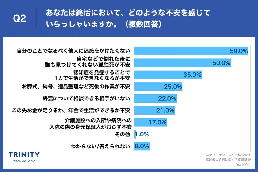 「Q2.あなたは終活において、どのような不安を感じていらっしゃいますか。(複数回答)」(n=100)と質問したところ、「自分のことでなるべく他人に迷惑をかけたくない」が59.0%、「自宅などで倒れた後に、誰も見つけてくれない孤独死が不安」が50.0%、「認知症を発症することで1人で生活ができなくなるか不安」が35.0%という回答となりました。