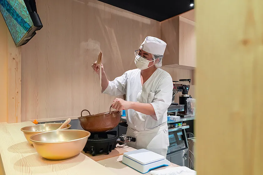 雲ノ茶 KUMONOCHA 錦市場店の看板メニューは笹屋昌園とのコラボで実現した本わらび餅です。国産わらび粉の中でも1%しか抽出できない高品質な本わらび粉を使用し、店内調理でひとつひとつ注文が入ってから練り上げ、出来たてを提供します。それは、本わらび餅の独特のとろりとした食感は出来立てから3分しか味わえないからです。その後はとろりとした食感からプルプルとした弾力ある食感へと、変化を楽しめます。
