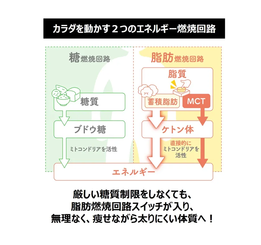 厳しい糖質制限をしなくても、MCTをとり入れることで、脂肪由来のエネルギー源「ケトン体」が増加することで脂肪燃焼が促されます。