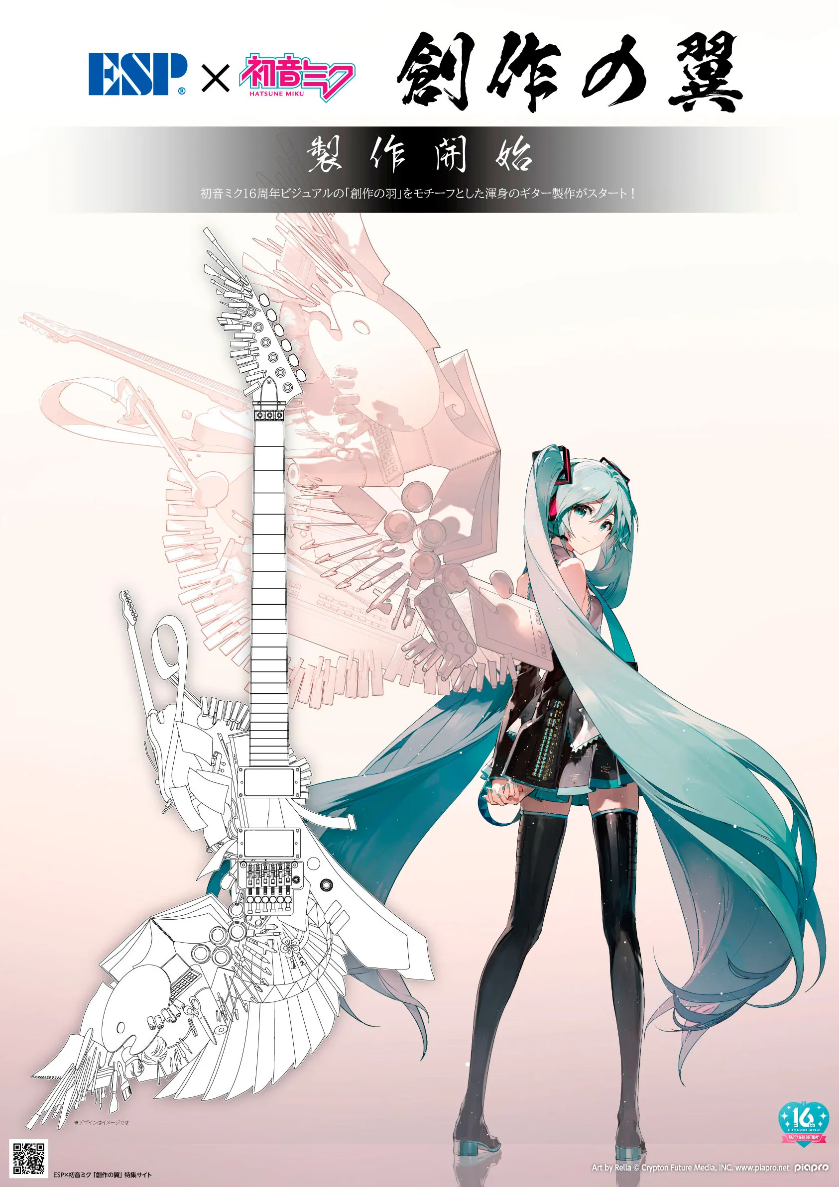 株式会社イー・エス・ピー(本部:東京都新宿区、代表取締役:渋谷尚武、以下 ESP)は、Rella氏の描いた初音ミク16周年のメインビジュアルに描かれている「創作の羽根」をモチーフにしたギター「創作の翼」の製作を開始しました。