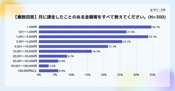 月に課金したことのある金額帯では、500円以下が34.7%と最も多い結果でした。次点は1,001〜3,000円の33.7%と、前述の課金平均額と似た結果になっていることが分かります。