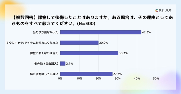 課金して後悔した理由に対する調査では、当たりが出なかったからが42.3%と最も多い一方で、特に後悔はしていないという回答も27.3%と3番目に多い結果でした。