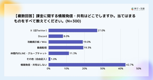 課金に関する情報発信・共有に対する調査では、情報発信・共有はしないという回答が42.7%と最も多い結果でした。発信場所としては、Xが27%と最も多く、攻略掲示板/Wiki、動画配信などの回答もありました。