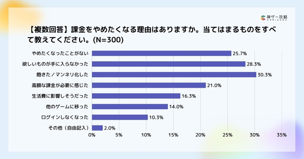 課金をやめたくなる理由に対する調査では、飽きた/マンネリ化したという回答が30.3%と最も多い一方で、やめたくなったことがないという回答が25.7%と3番目に多い結果となりました。