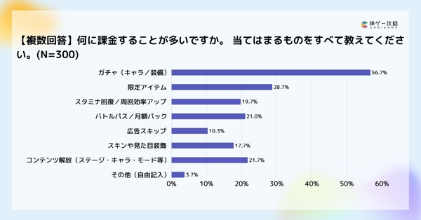 課金目的に関する調査では、ガチャ目的が56.7%と最も多い結果でした。その他の項目は投票数に大きな差はなく、ゲームユーザーはガチャ目的で課金をしていることが分かります。