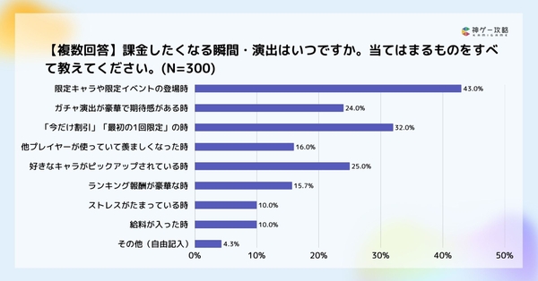 課金したくなる瞬間・演出に対する調査では、限定キャラや限定イベントの登場時が43%と最も多く、次いで「今だけ割引」や「最初の1回限定」が32%と、いずれも「限定」に関する演出が上位でした。