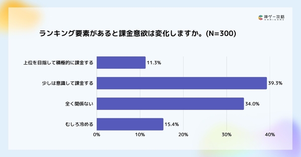 ランキング要素があると課金意欲は変化するかという調査では、少しは意識するという回答が39.3%と最も多い一方で、次点では、全く関係ないという回答が34%でした。「上位を目指して積極的に課金する」「少しは意識して課金する」というランキング要素がプラスに作用する回答が合計50.6%、「全く関係ない」「むしろ冷める」というマイナスに作用する回答が合計49.4%と、ランキング要素の影響は、プラスとマイナスで半々でした。