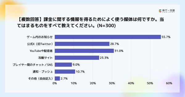 課金情報を得るための媒体に対する調査では、ゲーム内のお知らせが55.7%と最も多い結果でした。公式X、YouTubeや配信者、攻略サイトなどの、SNS、他メディアも幅広く活用されています。