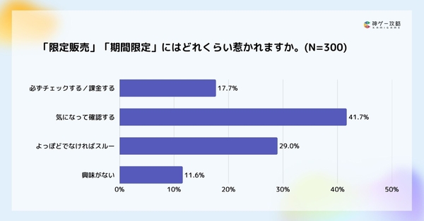 「限定販売」「期間限定」にどれくらい惹かれるかという調査では、気になって確認するという回答が41.7%と最も多い結果でした。必ずチェック/課金するという回答と合わせると、53.4%となり、半数以上のユーザーは「限定」に注視していることが分かります。