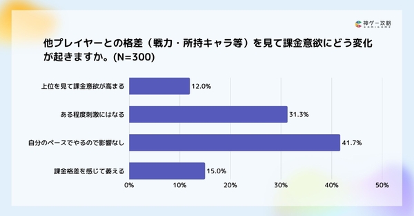 他プレイヤーとの格差を見て課金意欲に変化があるかという調査では、影響なしが41.7%と最も多い結果でした。他プレイヤーとの格差がプラスに作用する回答は合計43.3%、マイナスに作用する回答は合計56.7%となり、ランキング要素よりも他プレイヤーとの格差は、課金意欲に対して若干マイナスに作用しているようです。