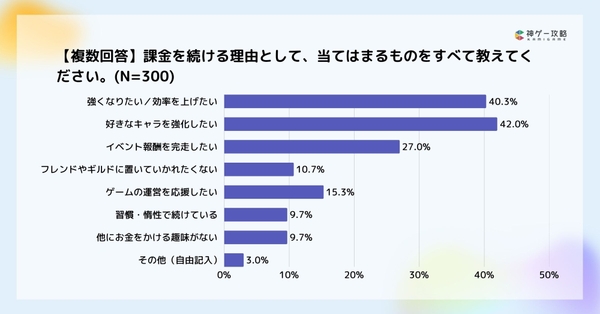 課金を続ける理由に対する調査では、好きなキャラを強化したいが42%と最も多く、効率を上げたい、イベント報酬を完走したいという、ゲームで良い結果を残したいという回答が上位でした。一方で、ゲーム運営を応援したい、習慣・惰性で続けているなどの、ゲーム内での結果以外の面で課金を続けている人も一定数いました。