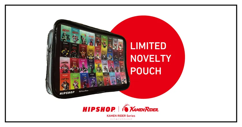 また、全国のHIPSHOP各店およびHIPSHOPオンラインサイトにてKAMEN RIDER Seriesを3点以上(KIDS size含む)ご購入いただいたお客様に、先着でHIPSHOP KAMEN RIDER Series オリジナルポーチをプレゼント。