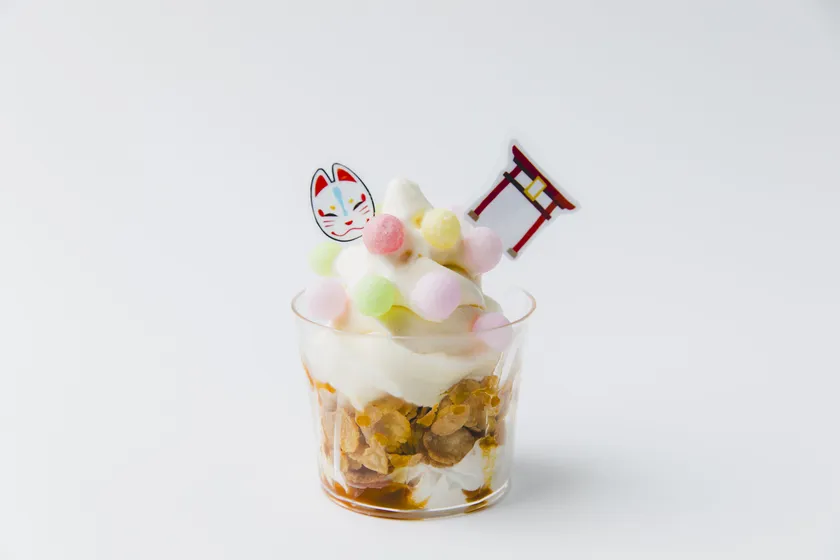 狐面と鳥居のモナカがのったミニパフェ。