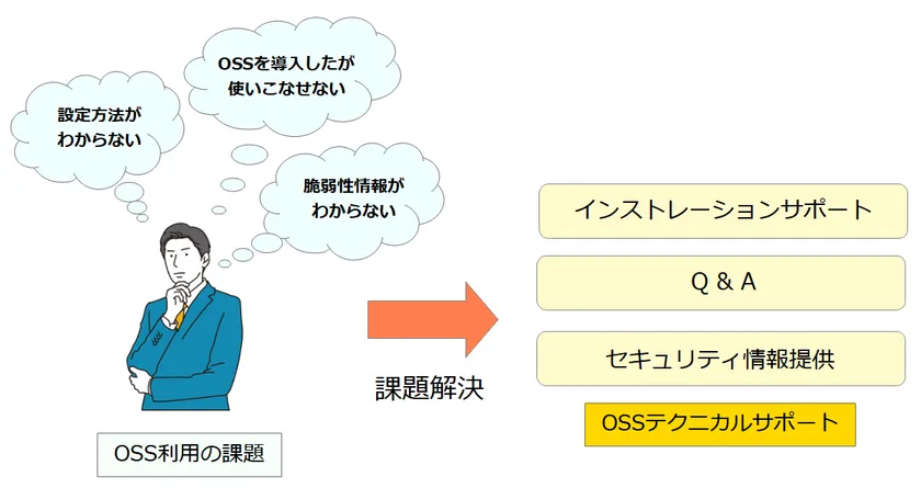 本サービスは、OSSの導入や運用に対する安心を届けるためOSSに特化したサポートを提供します。