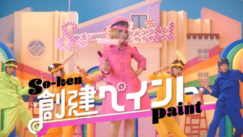 ピンクの作業着と作業用メガネがついたピンクの帽子で、ペイント用のローラーを持ったIKKOさんが、カラフルな4人の塗装隊(ダンサー)と歌って踊りながら「創建ペイント」のサービスの特徴を紹介。