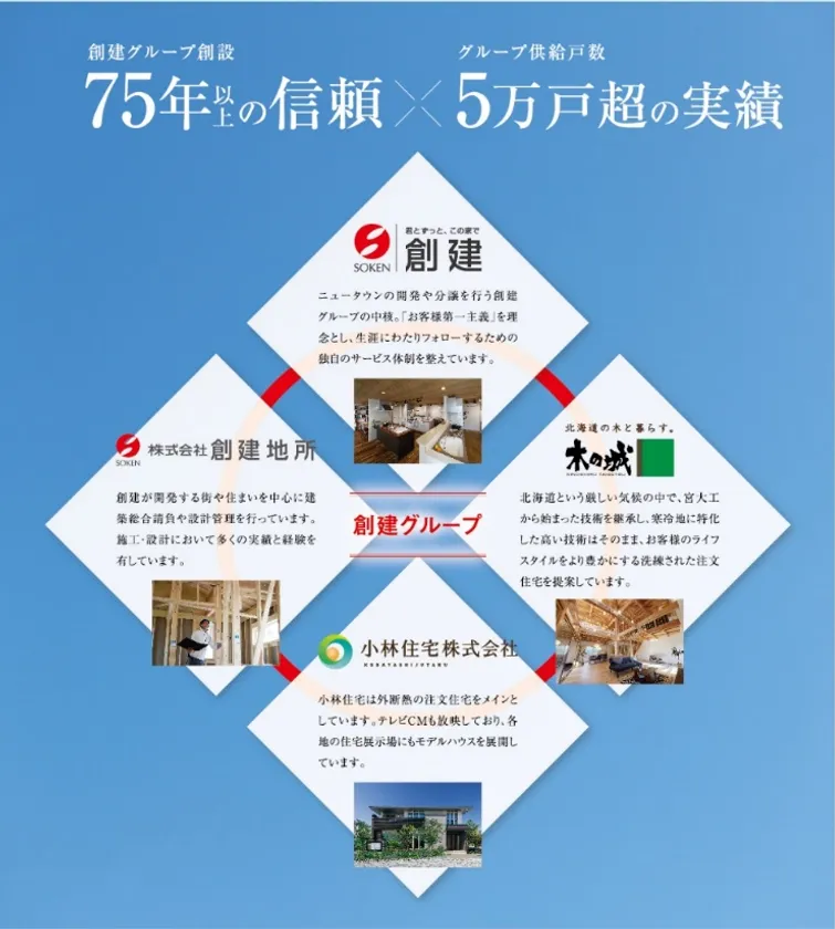 当社は創建グループ(株式会社創建、株式会社創建地所、株式会社木の城たいせつ、小林住宅株式会社)として、創設75年以上の信頼と5万戸超の供給戸数の経験とノウハウにより、外壁塗装に3つの「安心」をご提供いたします。