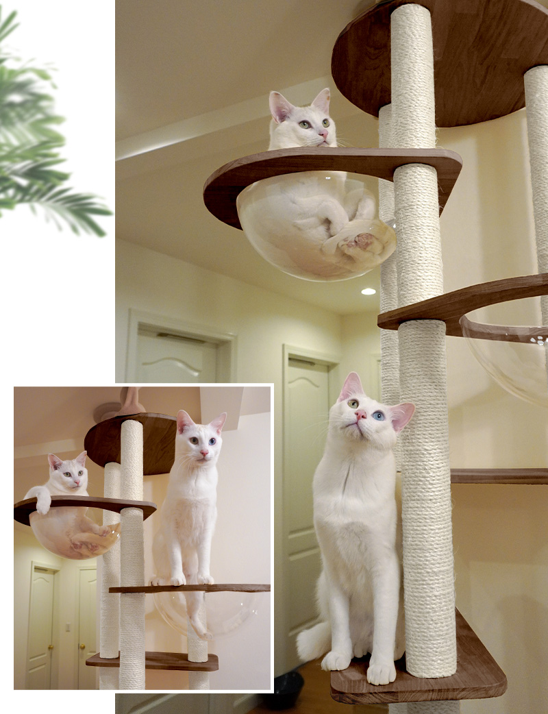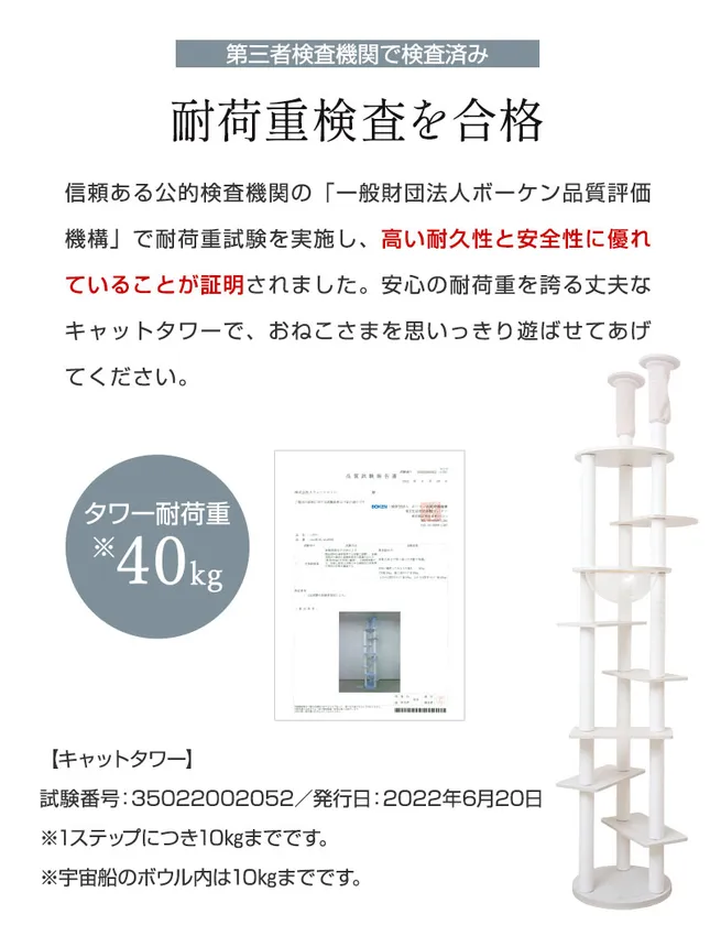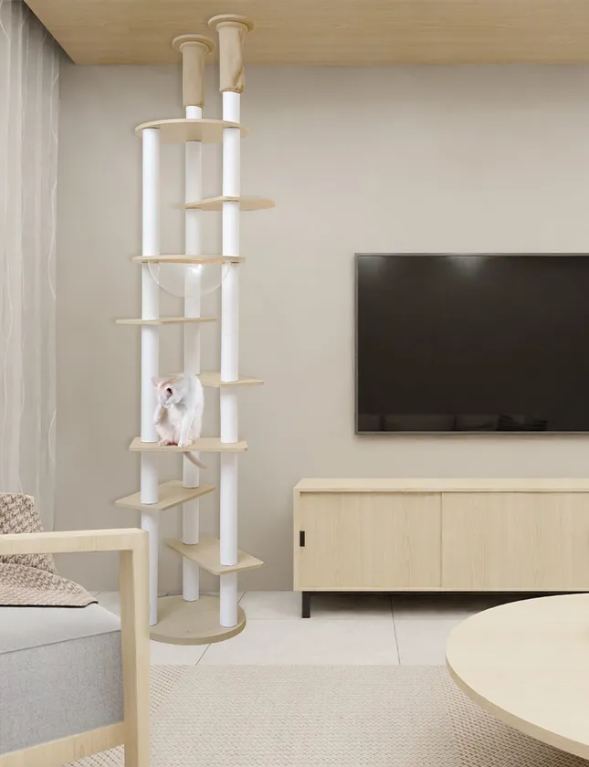 コンパクトで安定感のある3本支柱構造で、天井は突っ張り式。第三者機関にて耐荷重検査を行うなど、安全面を考慮しました。さらに企画段階から獣医師に監修いただき、ステップは低めの25cm段差にすることで、子猫から老猫まで上り下りも楽々。また、爪とぎポールは日本の職人が1本1本手巻きをしているため、沢山遊んでも丈夫で長持ち。万が一壊れてしまっても、壊れたパーツのみを購入すれば長くお使いいただけます。