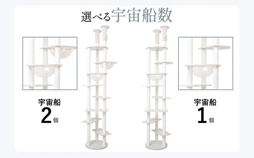 ステップのカラーだけでなく、宇宙船の数を1個または2個からお選びいただけます。宇宙船が1個だとおねこさま同士でケンカになることもしばしば。1匹1匹にお気に入りの指定席が見つかります。また、宇宙船に入った姿や肉球を眺めるのは飼い主様の特権です。