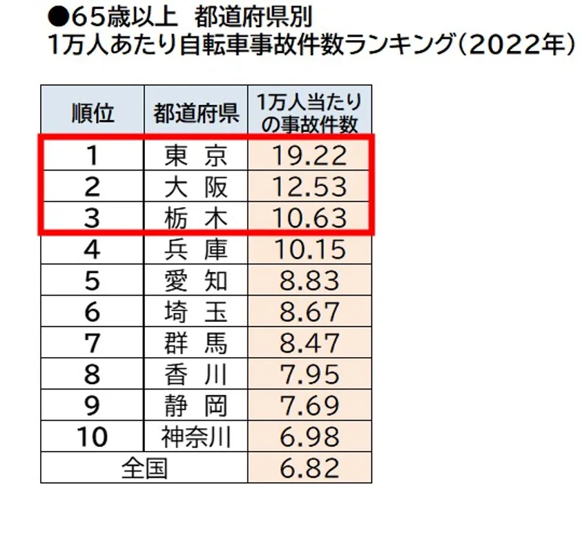 ●65歳以上の1万人当たりの事故件数ワースト1位「東京都」、2位「大阪府」、3位「栃木県」