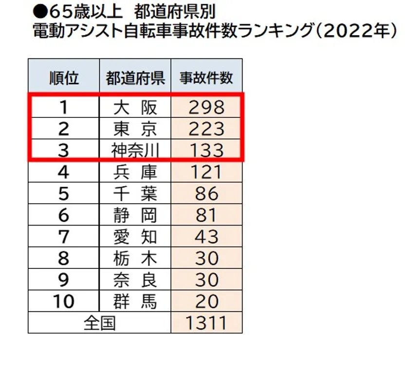 ●65歳以上の電動アシスト自転車事故件数ワースト1位「大阪府」、2位「東京都」、3位「神奈川県」
