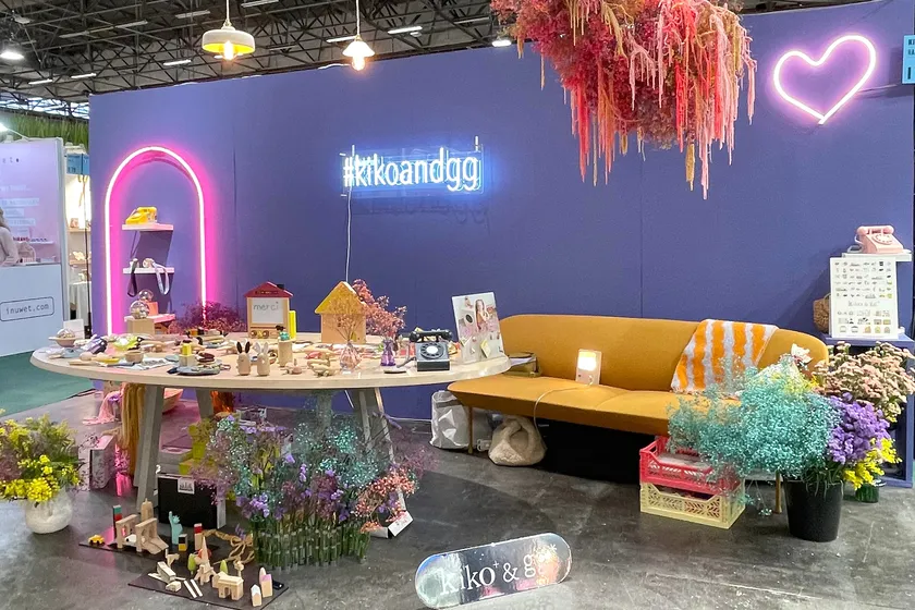 株式会社Kukkia(クキア)は、同展示会に、コロナ禍で渡仏できなかった期間を除き、2011年から毎年2回欠かさず出展しています。今年9月のメゾン・エ・オブジェでは、待望の新作おもちゃを発表。今回の展示ブースのデザインテーマは『カラフル × Japon』です。『今年の7月で創業して15周年を迎えました。その節目にふさわしい、カラフルで目を引く木のおもちゃやネオン、さまざまな什器で彩ったkiko+ & gg*の世界をぜひ見てほしい』とクリエイティブディレクター Kaz* Shiomiは話します。