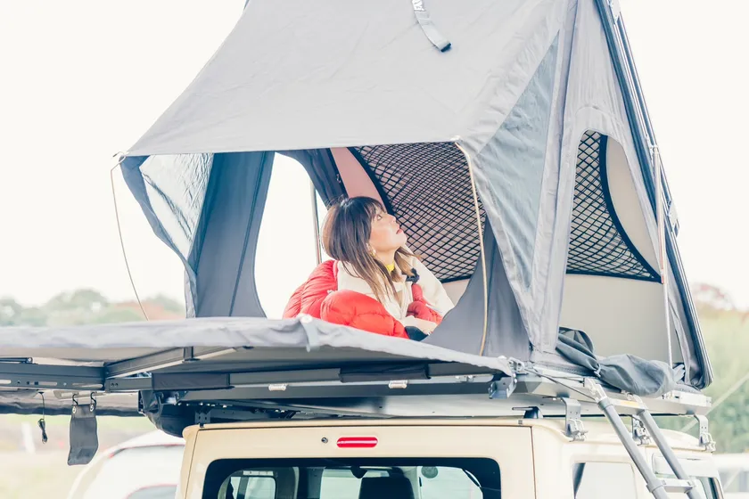ただのジムニーシエラではなく、屋根の上にルーフテントが乗った車上泊できるジムニーシエラです。