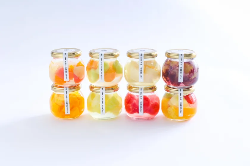 フルーツの本当のおいしさを最大限に引き出すために作ったゼリーです。フルーツ専門店が季節ごとに取りそろえる日本並びに世界各地の旬のフルーツを厳選し、素材ごとに最適な食べ頃を選んで使用しています。また、フルーツをとじ込めている、とろけるような独特のゼリーは、動物性のゼラチンは使用せず、海藻から抽出した植物性のゼリーでできており、香料や保存料も使用していないため、体に優しくどなたでもお召し上がりいただけます。