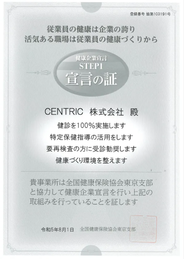 CENTRIC株式会社 健康経営の取組として 全国健康保険協会東京支部の「健康企業宣言」へエントリー、 「宣言の証」を取得