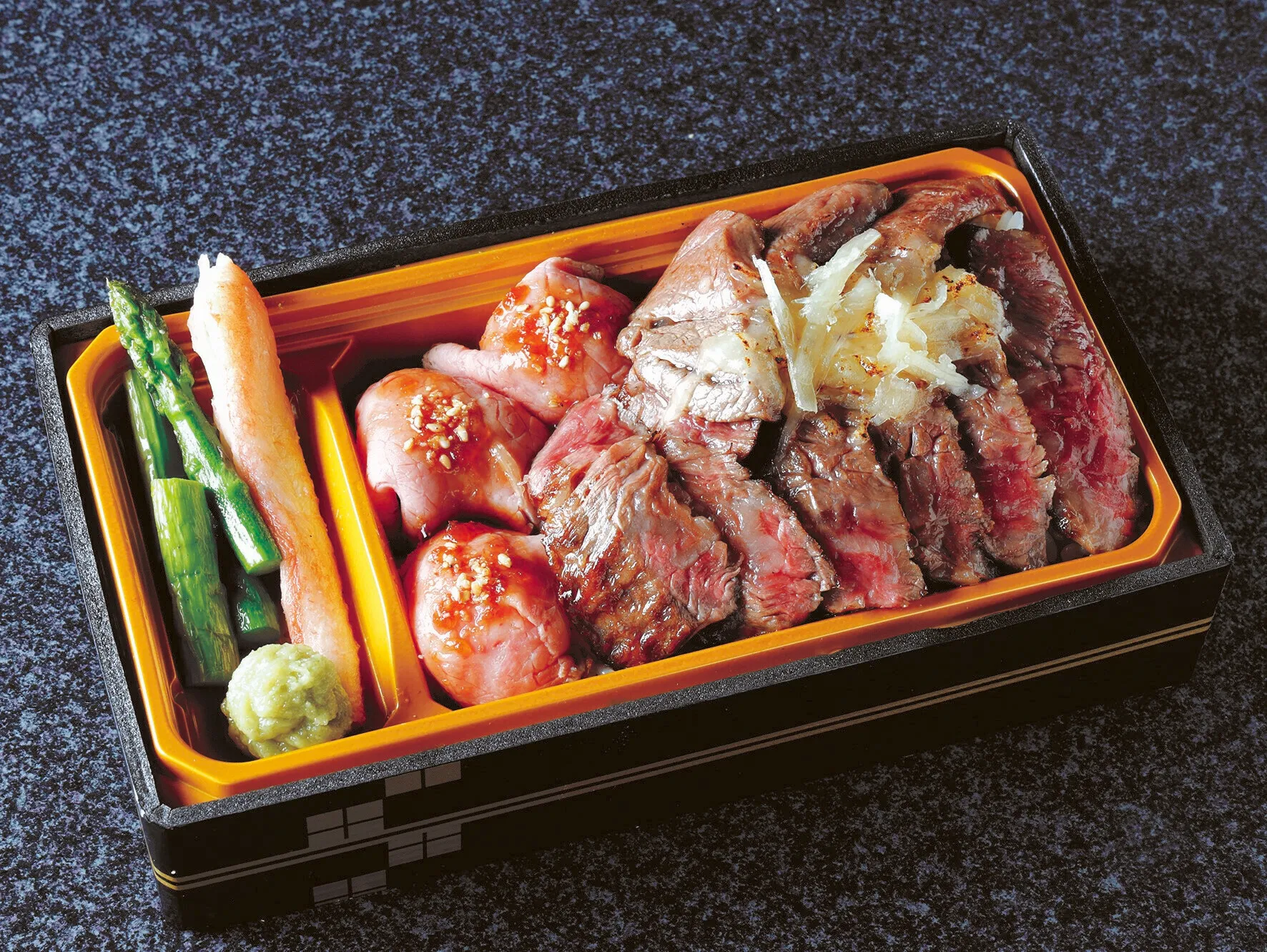 独自開発のエサとストレスフリーな環境で育った「サロマ和牛」は、国内はもちろん海外でも高く評価を受けています。バイヤー自ら佐呂間の牧場を視察し、エサへのこだわりや牛優先のストレスフリーな環境「アニマルウェルフェア」などに感銘を受けました。脂肪がキメ細かく繊細な肉質を味わっていただくため、贅沢なお弁当をご用意しました。