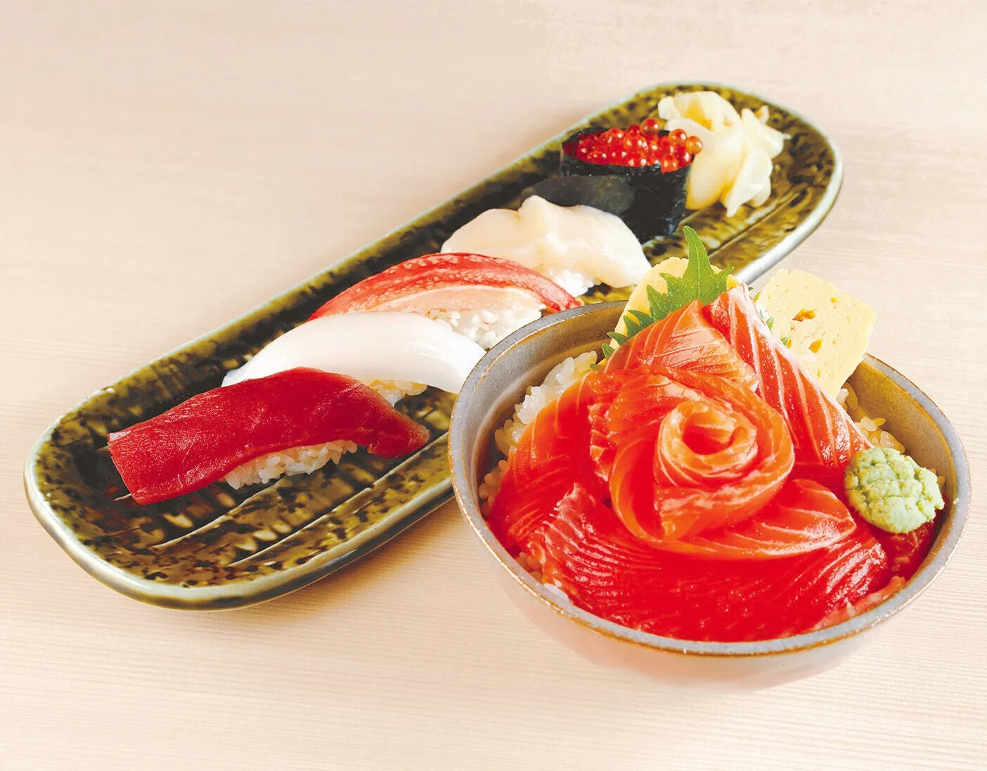 日高沖で獲れる上質な鮭「銀聖鮭」を使用したミニ丼がついたスペシャルなセット。