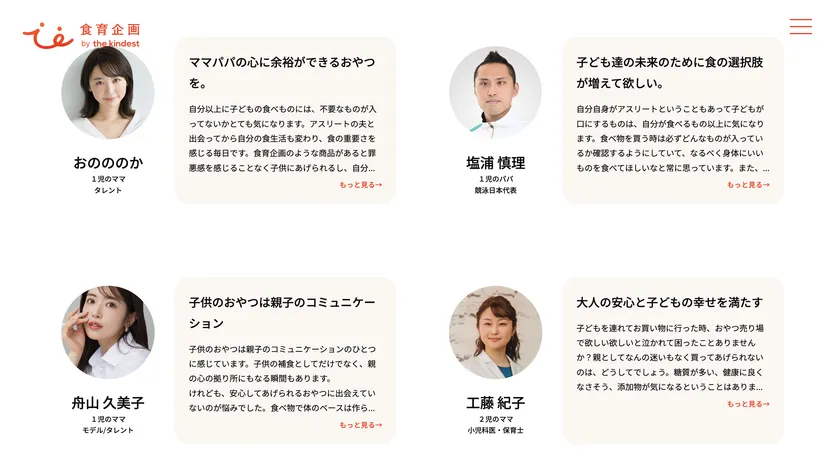 『食育企画 by the kindest』特設サイト内では、共同開発者である長友夫婦や子育てしながらご活躍されているアスリートや専門家などの著名人の方々から寄せられたメッセージを公開しています。今後、新商品の情報や食育に関するイベント情報など順次公開していきますので、ご期待ください。
