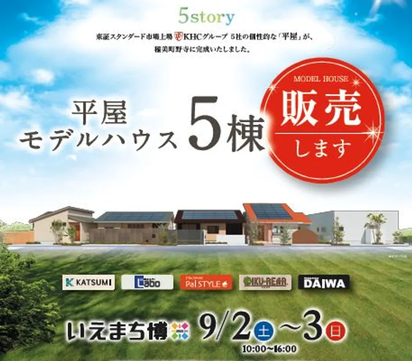KHCグループ5社で、“5 story”と銘打って各社それぞれの特色を生かした平屋モデルハウスを5棟同時にお披露目します。夫婦二人でのんびりした生活、ペットと共に暮らす生活、子育てを楽しむ生活、BBQやDIYを堪能する生活、スタイリッシュな建物での生活など、お客様自身に合ったライフスタイルを実現する参考にしていただけます。