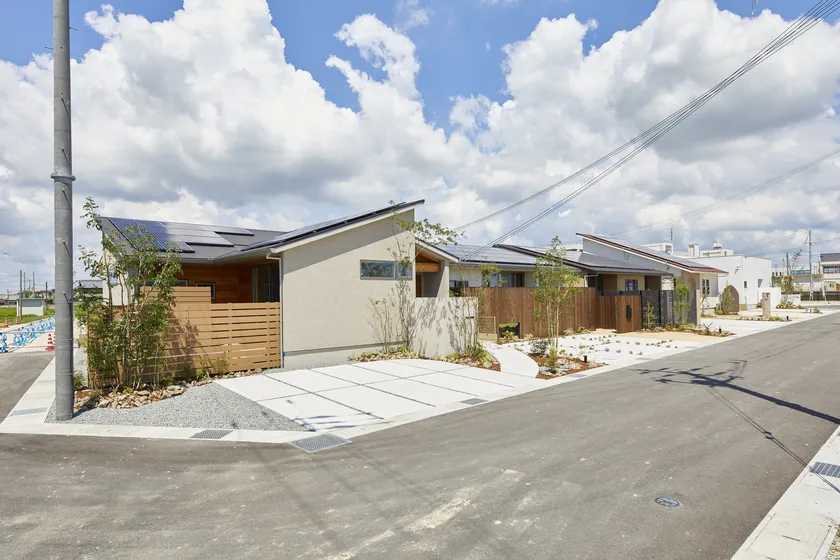 兵庫県加古郡稲美町は、播磨平野の東部に位置し、東に神戸市、南に明石市、西は加古川市、北は三木市と隣接しており、水と緑にあふれた美しい田園風景が広がっています。その地域特徴を活かして、全18区画60坪以上とし、「平屋専用分譲団地」とすることで、隣に2階建て以上の住宅が建てられることがなく、日当たりや景観が損なわれることがないよう工夫しました。平屋を通じて注文住宅の魅力を訴求し、住宅取得の潜在ニーズを引き出すことで、生活される方々が想い想いの暮らしを楽しめるように計画しました。