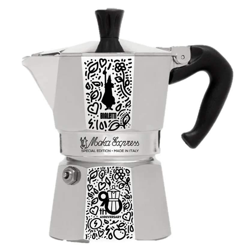 モカエキスプレスは、沸騰した水の蒸気圧を利用してコーヒーを抽出する、直火式のコーヒーメーカーで、1933年にアルフォンソ・ビアレッティ(Alfonso Bialetti)により発明されました。今ではイタリアの各家庭に1台は必ずあるといわれ、伝統を守りながら、常に新しい世代に受け入れられてきたイタリアンアイコンです。そのモカエキスプレスが90周年を迎えるにあたり、クリエイティブで遊び心に溢れたドゥードゥル(=いたずら書き)をあしらった、限定バージョンを発売いたします。
