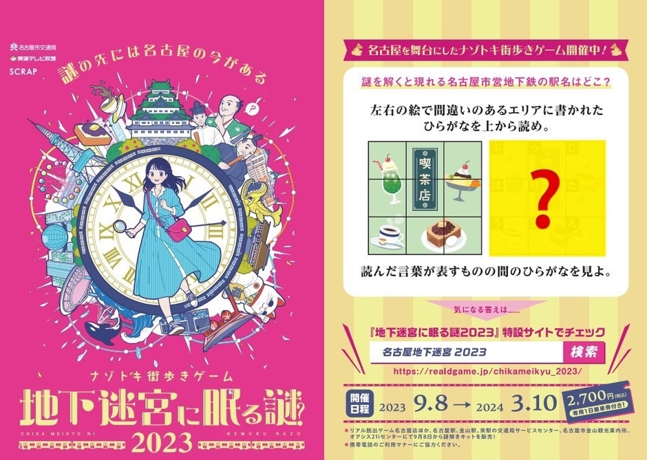 リアル脱出ゲームを主催、企画制作する株式会社 SCRAP(所在地:東京都渋谷区、代表者:加藤隆生)は、東海テレビ放送(所在地:愛知県名古屋市、代表者:小島 浩資)および名古屋市交通局(所在地:愛知県名古屋市)は、3社共催にて開催するナゾトキ街歩きゲーム『地下迷宮に眠る謎2023』の開催を記念して、本日2023年9月1日(金)から10月31日(火)までの期間限定で、謎を掲出した名古屋市営地下鉄東山線の特別列車の運行決定を発表いたします。