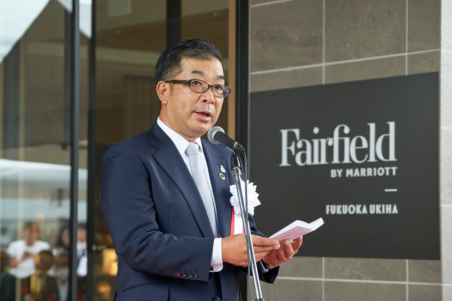 そしてこのホテルに隣接をいたします、道の駅うきはは、今申しましたような地元でとれた新鮮な旬の野菜や果物が本当にお手ごろな値段でお買い求めいただける。そしてまたこういった食材を使ったおいしい食事も楽しんでいただける。福岡県として、うきは市、久留米市、朝倉市をヘルス&ビューティーのゾーンという観光のゾーンに位置づけまして、20余りのヘルス&ビューティーに関する体験メニューを整えて、たくさんのお客様をうきは市、久留米市、朝倉市エリアに呼び込んでいきたいと思っております。このような地域に立地するフェアフィールド・バイ・マリオット・福岡うきはは、宿泊特化型のホテルということでありますので、宿泊客の皆様方には周辺施設を巡っていただくだけでなく、地域の飲食店もご利用いただいておいしい食事を楽しんでいただきたいと思います。こういった点からうきは市はもとより、周辺地域に及ぼす経済波及効果は非常に大きなものがあると期待しているところでございます。また、世界にホテルを展開されているマリオット・インターナショナル、このマリオットが運営されているホテルになりますので、インバウンドの皆さんもぜひマリオットの力でたくさんうきは市に呼び込んでいただけるものと心より期待をしております。