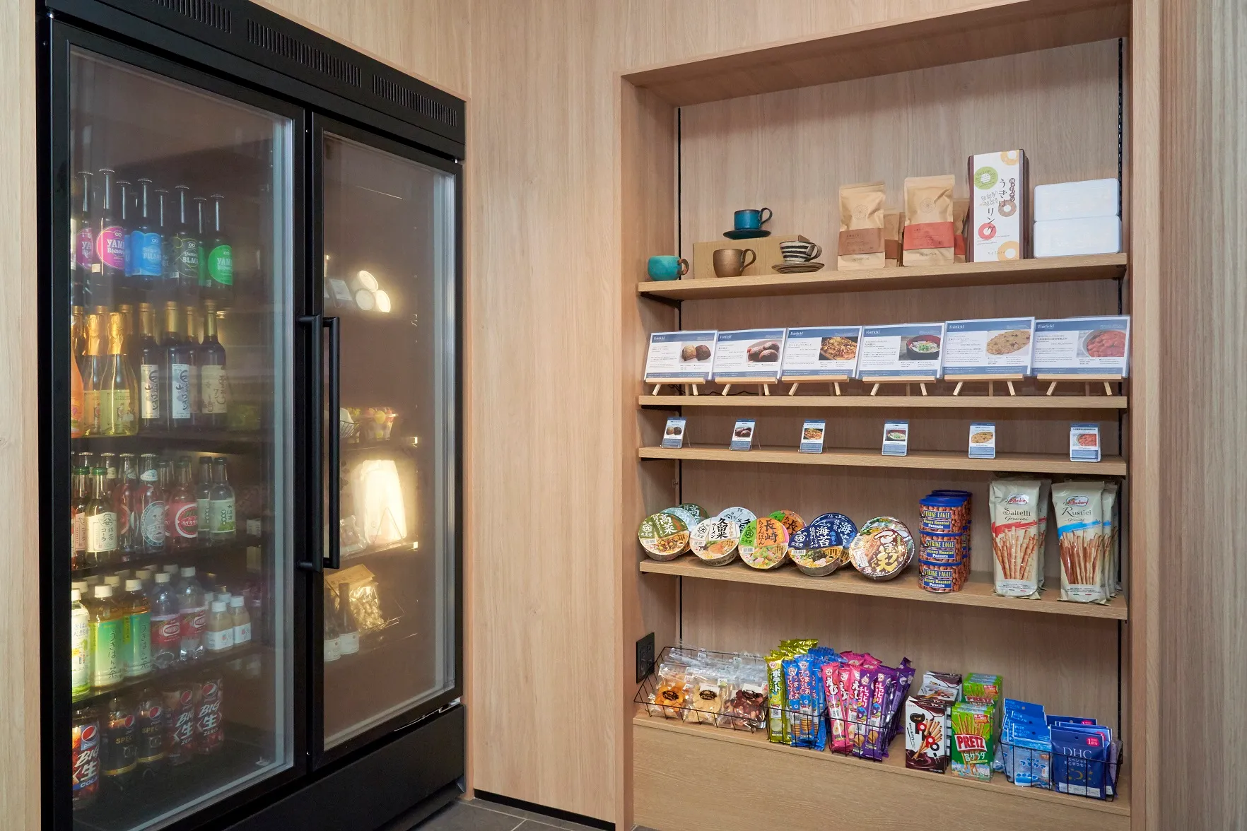 1階には、道の駅や近辺のお店などで購入した食材を食べることができ、ワーケーションなどで使用できる電源が設置されている「共用スペース」、ドリンクやお土産の購入が可能な「マーケットプレイス」、その土地にちなんだ工芸品や書物を展示する「ライブラリー」を設置しております。