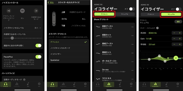 複数のプリセットから選択、もしくはお好みで設定したカスタムEQをShurePlus™ PLAYアプリで作成し、アプリを使用して好みの音で再生が可能。パラメトリックEQを採用することで、通常のグラフィックイコライザーよりも細かく設定が可能。音楽ストリーミングサービスなどの外部プラットフォームにもEQ設定が有効になります。