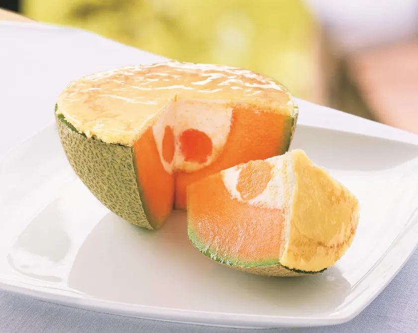 富良野産赤肉メロンの半玉を使用した贅沢ケーキ。上にはもちっとした食感のクレープ生地。