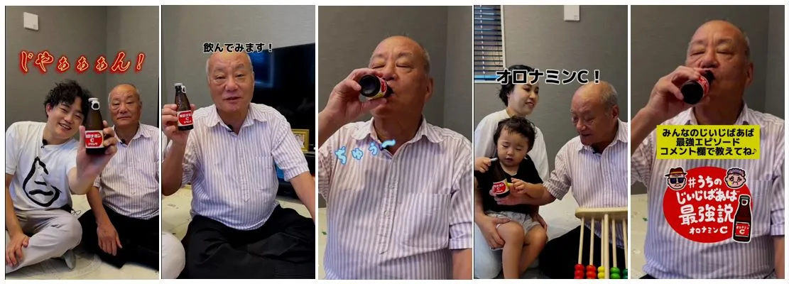 大塚製薬株式会社のオロナミンC ドリンクは、「#うちのじいじばあば最強説」企画を2023年9月5日(火)より開始します。本企画では、じいじ・ばあばが元気に活躍している人気TikTokクリエイターの皆さんが自身のアカウントにて祖父母の最強エピソード動画を、懐かしいCMソングに乗せて公開。9月18日(月)敬老の日までの期間、各クリエイターの「#うちのじいじばあば最強説」動画コメント内で、じいじ・ばあばの最強エピソードをお待ちしています。
