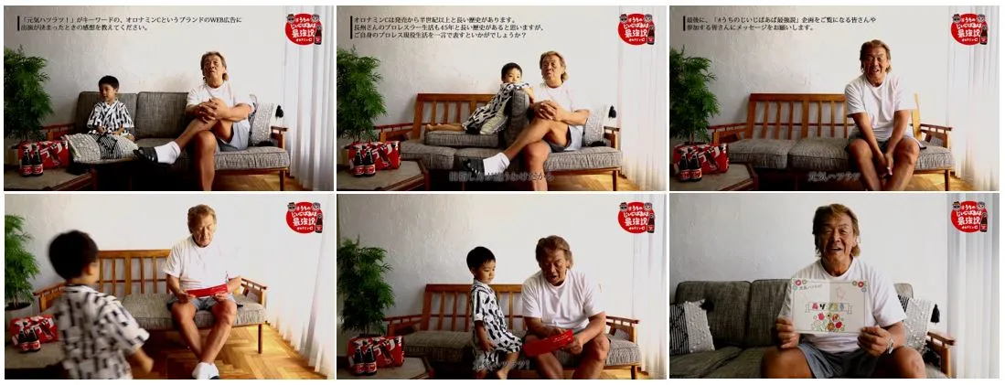 スマホを手にソファに寝転ぶ最強じいじ長州力さんの様子を見ていた由真くんが、「じいじ、何してるの?」と一言。笑顔になる長州さんに「じいじ、いつもありがとう」と日頃の感謝を込めて、オロナミンCを手渡す。「知ってるか、由真!オロナミンCは黄色いんだ!これはビタミンB2本来の色だぞぉ!」と話し、長州さんはオロナミンCを飲む。由真くんの「元気ハツラツ?」というかけ声に、「いいね!オロナミンC」と元気いっぱいの長州力さん。