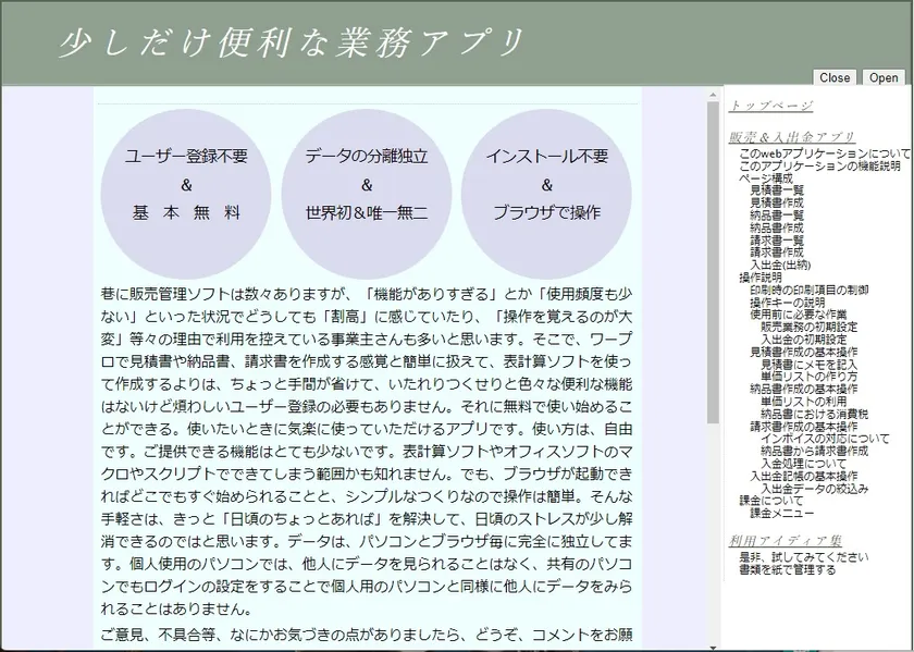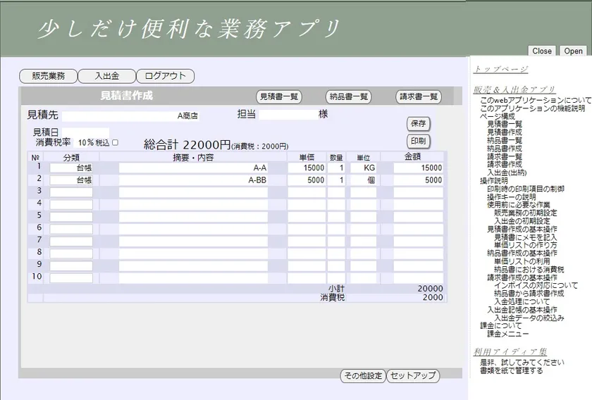 そこで、小規模事業者向に「見積書」「納品書」「請求書」「入出金帳」といった日常の業務においてワープロや表計算ソフトよりは簡素化された作業と最小限の機能に抑えることで利用するための費用を抑えながら小規模事業者に合った運用を目的に開発をした「少しだけ便利な業務アプリ」を公開いたします。