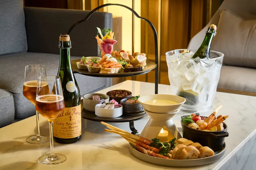 秋にぴったりのリンゴの自然な甘さが広がる「シードル」を含む10種のワインを、チーズフォンデュやハモンセラーノなどの料理とスイーツの数々と一緒にお楽しみいただけます。17時からのイブニングタイムにお酒と一緒にお楽しみいただける、大人のためのイブニングハイティーです。