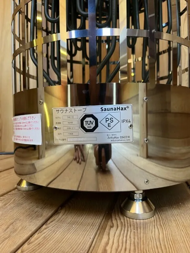 日本の電気機器はPSE認証が取れていないと販売できません。当社は更に厳格な試験を必要とするひし形PSE認証を取得し販売しております。試験時には数台のストーブが壊れました。それだけ、過酷なテストですが、逆に言うと、並行輸入等でPSE認証を受けていない機器は非常に危険です。SaunaHax-eは安心のひし形PSE認証済製品です。