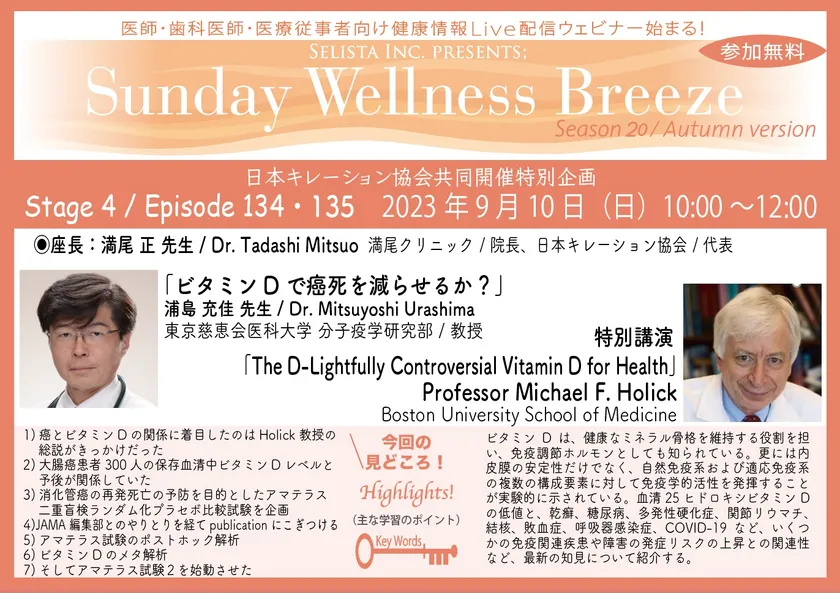 セリスタ株式会社(東京都千代田区、代表取締役:伊藤 承正)は、2023年9月10日(日)に、満尾正先生(満尾クリニック/院長、日本キレーション協会/代表)を座長にお迎えし、ビタミンD研究における第一人者の浦島 充佳先生(東京慈恵会医科大学 分子疫学研究部/教授)と、ビタミンD研究の世界的権威、Professor Michael F. Holick(Boston University School of Medicine/教授)による医師・歯科医師などの医療従事者向け無料オンラインセミナー『ビタミンDの重要性について学ぶ』を開催します。