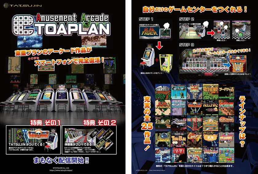 旧東亜プランのゲーム全25タイトルから好きなゲームを購入して、自分のスマホの中に東亜プラン専用のゲームセンターを作ることが出来るスマホアプリです。各タイトルはTATSUJINならではの「原作に忠実に」をモットーに旧東亜プランのアーケードゲームを再現しております。