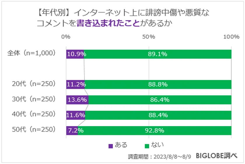 【年代別】インターネット上に悪質なコメントを書き込まれたことがあるか