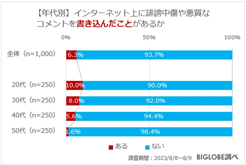 【年代別】インターネット上に誹謗中傷や悪質なコメントを書き込んだことがあるか
