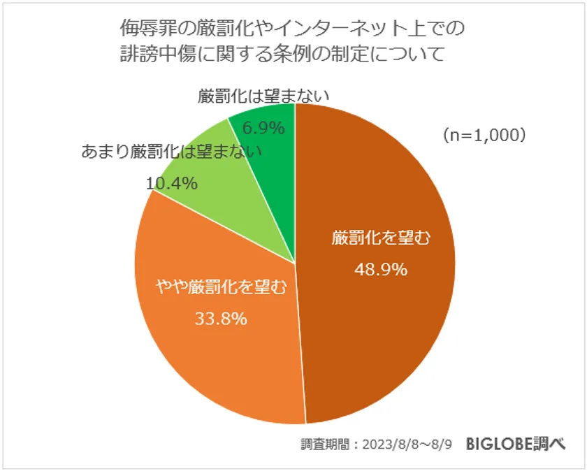 全国の20代から50代の男女1,000人に「侮辱罪の厳罰化やインターネット上での誹謗中傷に関する条例の制定について」を質問したところ、「厳罰化を望む」「やや厳罰化を望む」を回答した人の合計の割合は82.7%と8割を超えた。