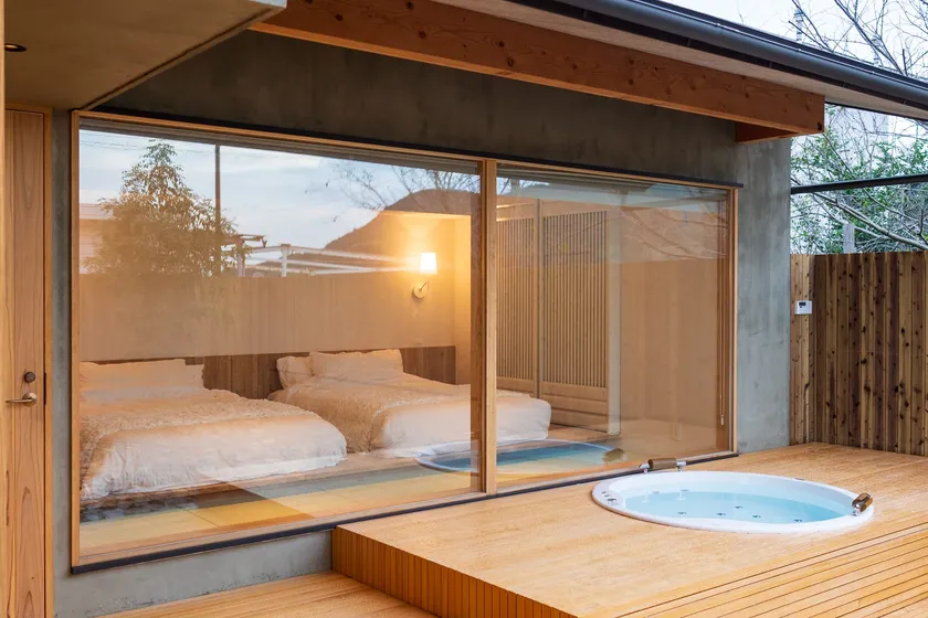 プライベート感のある専用の中庭、檜木で作られたジャグジーエリアを屋外に備えています。